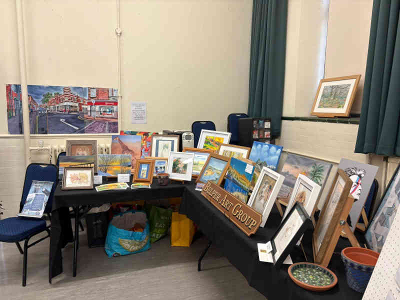 Albert is our oldest active member and we were also celebrating his ninety sixth birthday, which is why the large composite painting hanging in the middle was so prominent. It was painted in sections by a number of us and we couldn't see the result until it was hang as one piece. We have on a number of occasions done these sort of pictures as a group and they always cause a lot of fun and interest.