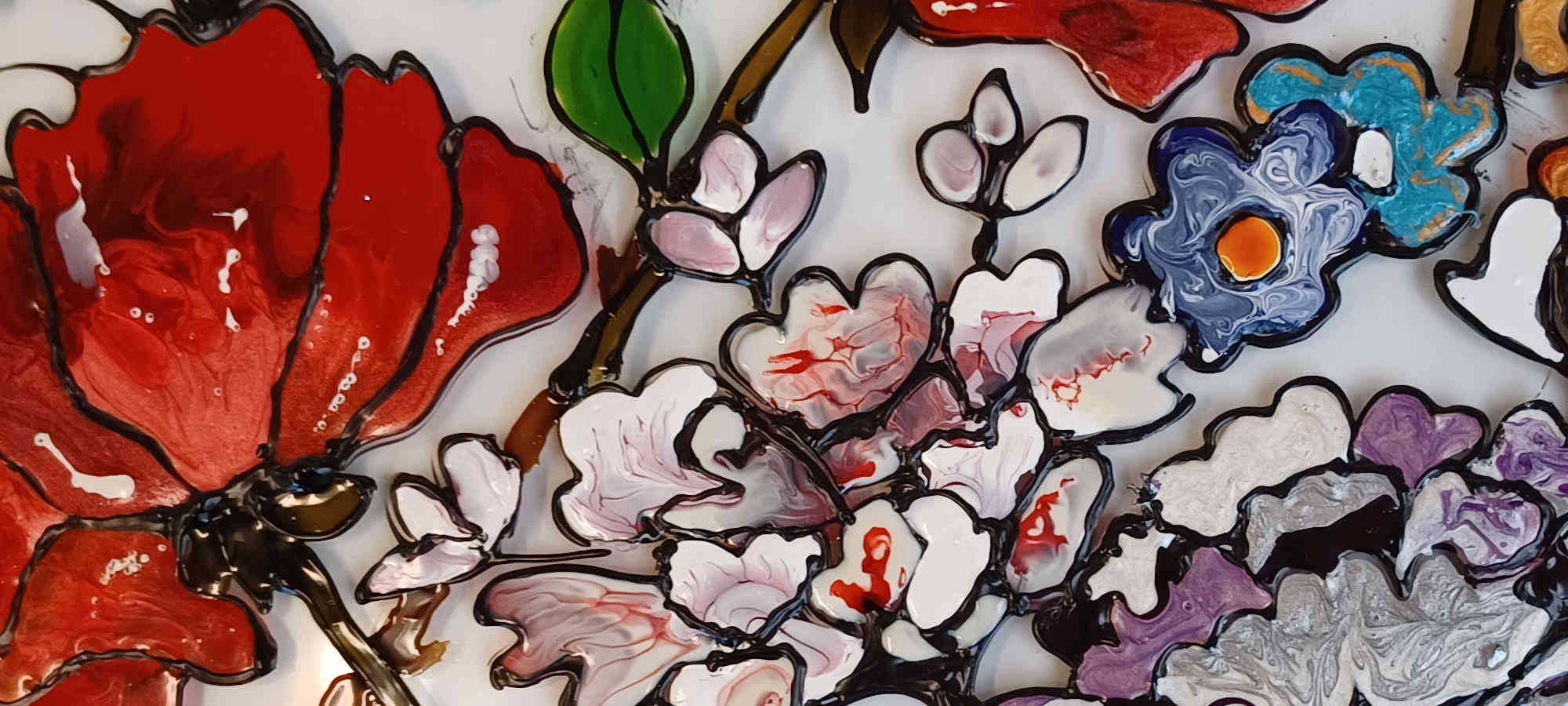 Before I say anything I have to hold my hand up, I love glass, the colours are just stunning, bright and vibrant, so I am biased. However, sometimes you sit down and struggle to get a picture to work and other times you just do something for the fun of it and it works! Jackie found some Glass Paints in her cupboard and few sheets of glass. She decided to just paint with them and the result is magical!