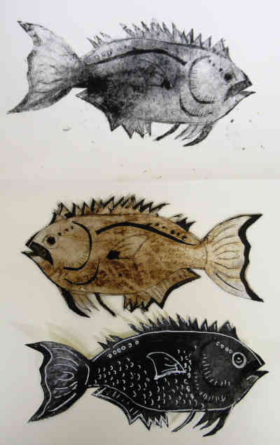 So the picture left shows the plate, in the middle and two prints above and below. The print below is made by inking up the plate and simply printing it and the resultant print is dark. Nicki has added a lighter line to her print, in this instance I think she drew onto the final print with a white marker. However, she could have removed ink as done with a basic monoprint. Prints like the top one are produced by reducing the ink on the shiny surface by taking multiple prints or by wiping off the ink. The cuts tend to hold the ink and therefore print darker.