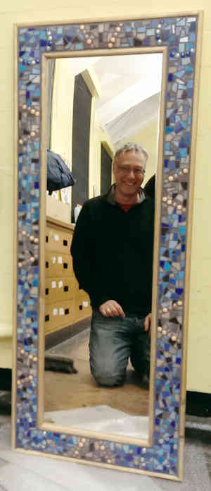 As a way to illustrate how diverse our group is here is a picture of Steve ‘just a member’ proudly kneeling in front of his latest piece, a mosaic mirror frame. However, Steve does not just do mosaics he also does Lino-Cuts and paints.