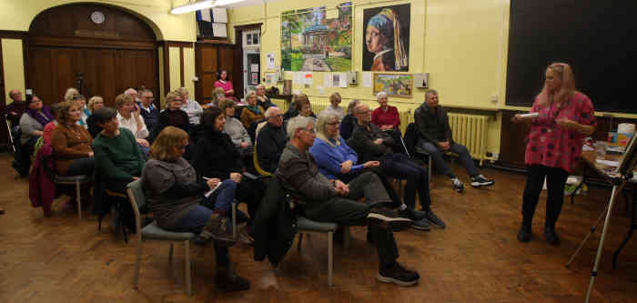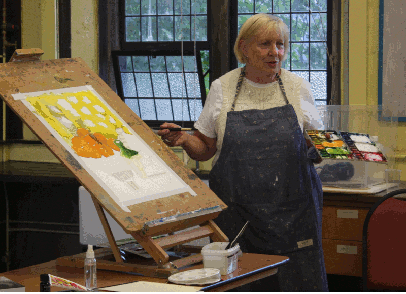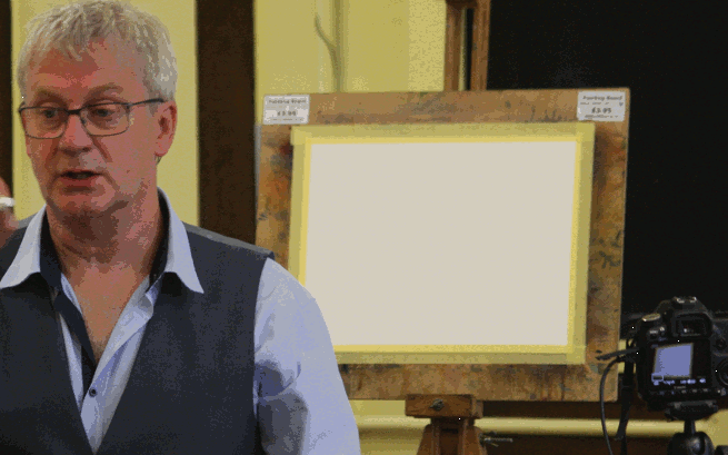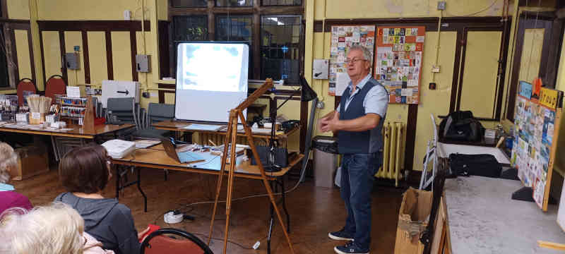 After a break of a couple of years caused by COVID demos are back and our first is a revisit from a favourite. Steven Coates who is shown here mid-flow during his demonstration on the Science of Watercolours, now you would think that might be a bit boring but I can assure you it was not. Going from very simple principles to quite complex science in a few minutes without leaving anybody behind, is quite a feat. But to do it in an entertaining way is an achievement, especially whilst painting.