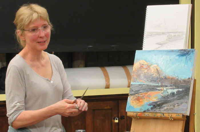 She works from the idea, through sketches to a monochrome under painting, in what seemed like a few moments. Yes, she did cheat in this case, for the sake of the demo but wouldn't you. The sketches and the ideas were already there but the process is fluid and from her own words, periodically she does things differently. So no fixed pattern here and then into the paint. A limited pallet but lots of paint going from a course outline blocked in with bold pallet knife strokes to finer and finer detail. Still with the pallet knife until finally the deepest detail is added with the pallet knife or brush as best suits the picture.