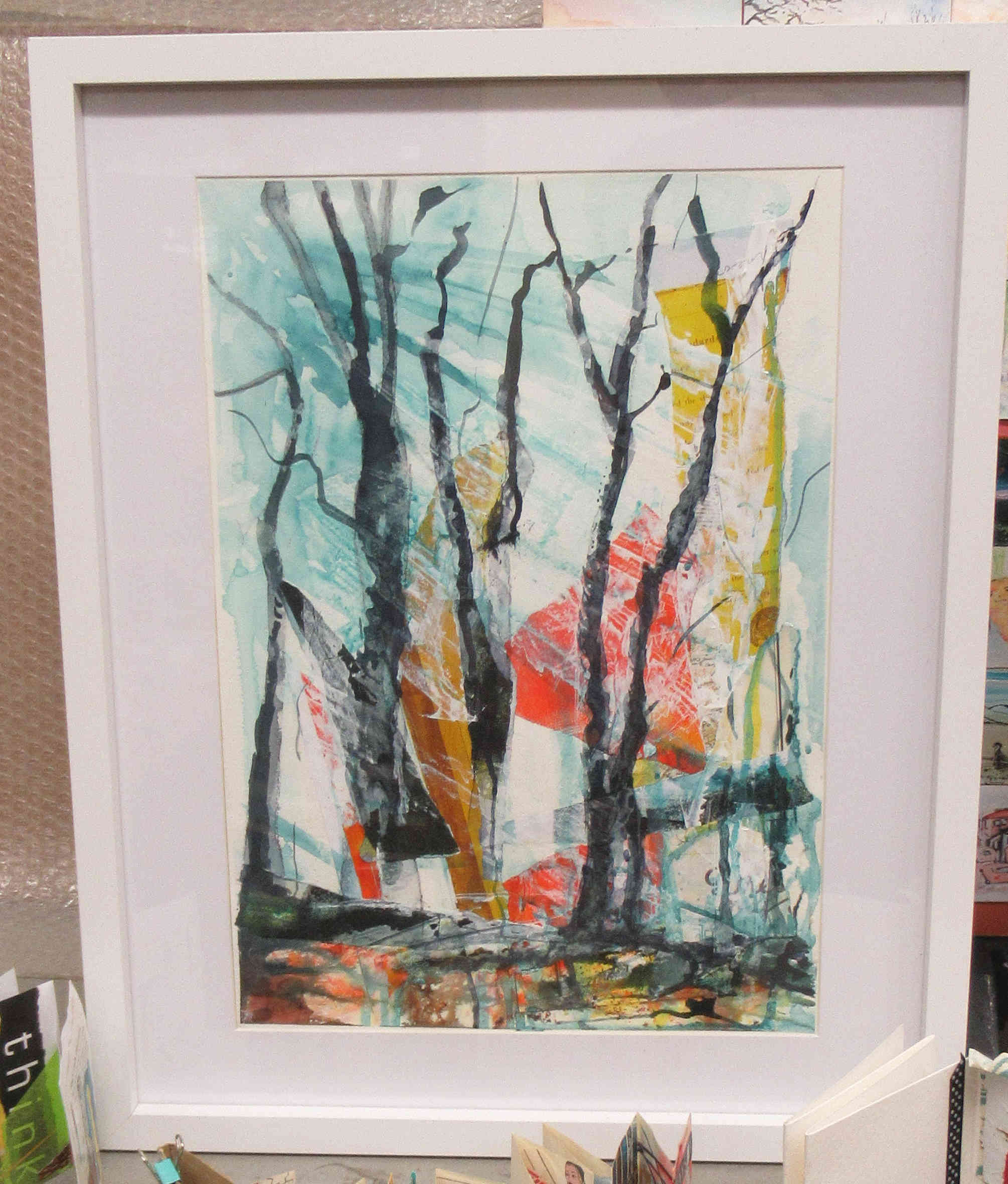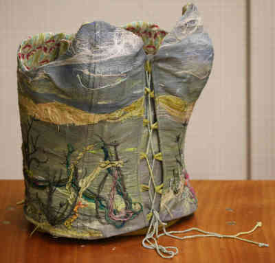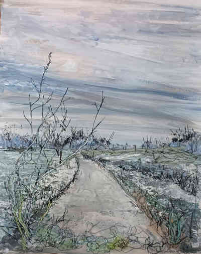 Kay's artwork is interesting to say the least she combines, fabrics, treads, acrylic, watercolour on whatever sub-straight suites the work, including hand made paper. Her pictures have depth, texture and feeling. This part done picture (her words not mine) is wonderful.