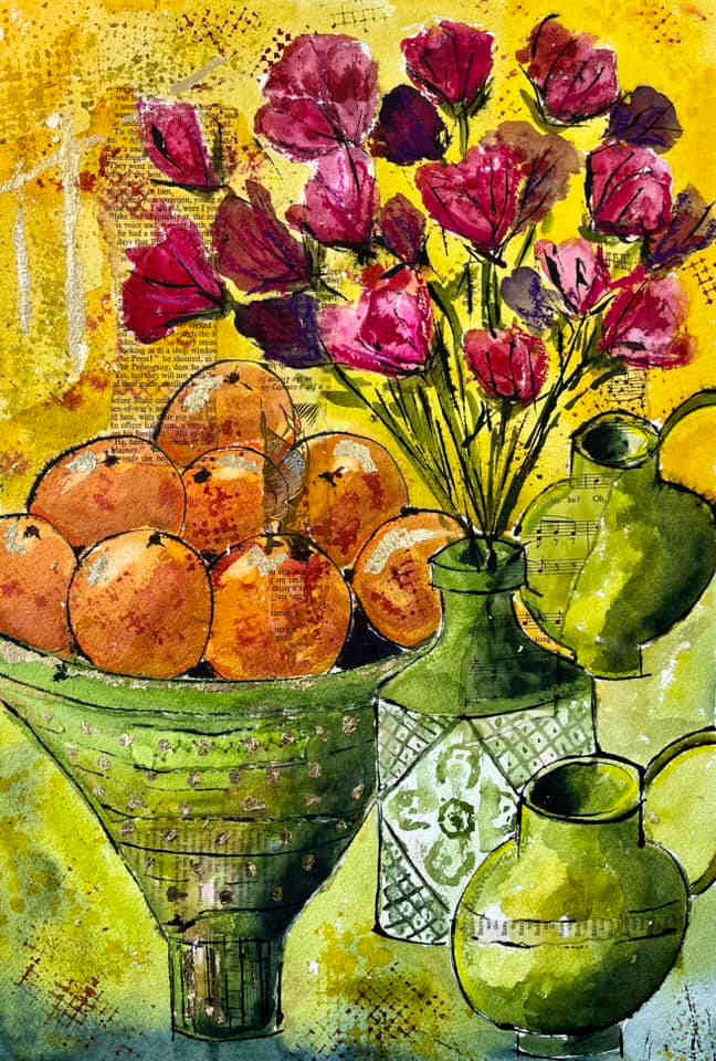 It's not the first time I have wondered at the picture someone has produced in watercolours with the water running down the page because the paper should be much flatter. In Kelly's case she boldly added the very strong colours of acrylic inks where don't blink or you have a permanent mark that cannot be changed in the middle of your picture right or wrong!