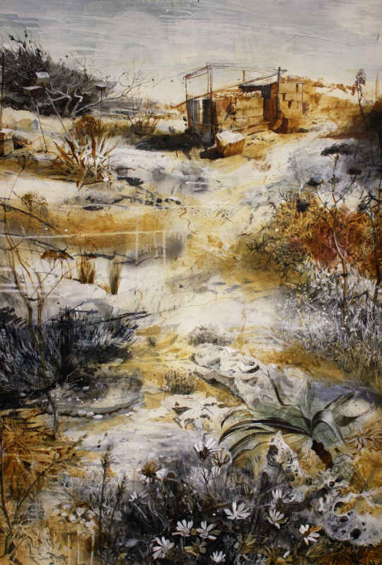 The picture to the left is painted with a limited pallet and is full of detail. In person the picture has much more impact and personality than is conveyed by my photograph. It seems to almost be made up of bits just stuck together like a montage but somehow it all make sense. Some of his current pictures are filled with a dark foreboding nature based on out interactions with nature and the environment.