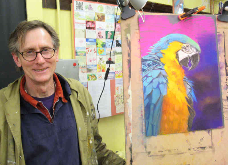 Julian Bray kept us all entertained last night whilst producing a lovely picture of a Macaw.