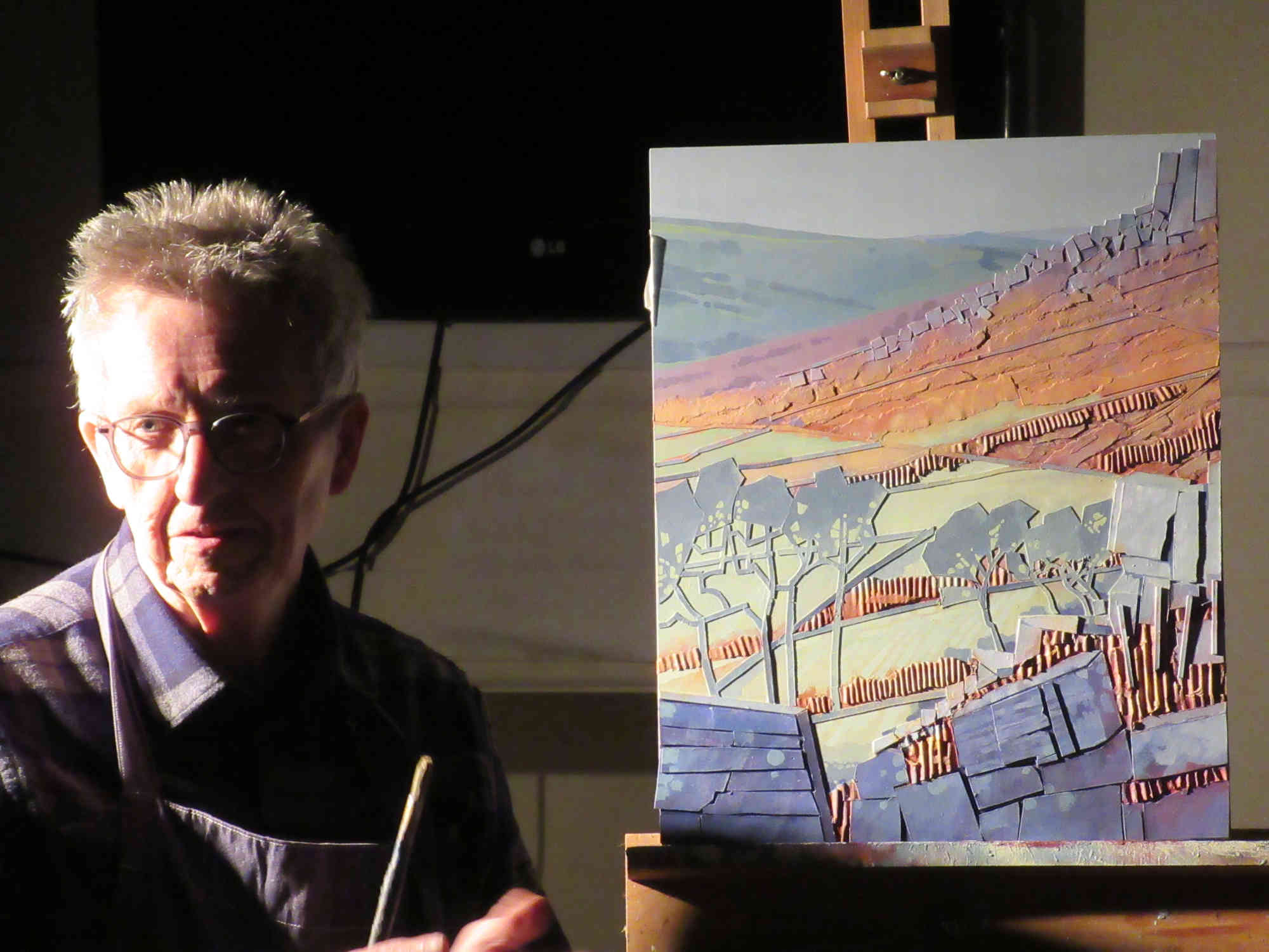 He is also very interested in the Millstone Grit Edges of Derbyshire and is painting a series of very interesting picture based on our uplands. He is pictured beside one of these almost complete pictures and it is very very interesting.