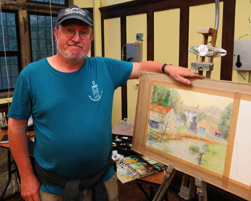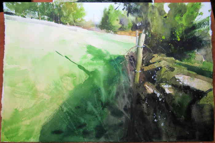 the bit we all want to see is as he acknowledges different from those painted by most, with a strong feature of the wall in the foreground running into the picture. We all watched with great interest as until the very late stage it was not clear how the two halves of the picture left and right of the post would merge. However, once the shadows went in the two parts became one and the picture was complete.